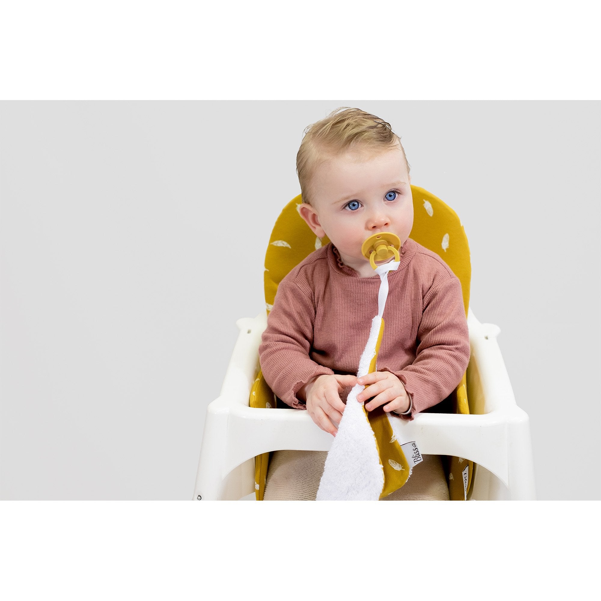 Dit comfortabele Wallabiezzz inlegkussen okergeel met witte Veertjes, is ontworpen voor de Antilop kinderstoel van Ikea. Het kussen is gemakkelijk in gebruik. Schuif gewoon de achterkant van het kussen over de rugleuning, zodat het kussen mooi op zijn plaats blijft. Er zijn ook openingen zodat de riem zoals gewoonlijk kan worden gebruikt.