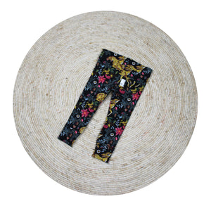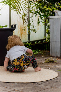 The bottom is made of elastic cotton with a beautiful print. The top edge is made of wide and sturdy elastic so that the bottom does not fall down quickly. The legs can easily be turned up, making the bottom wear longer. But our nicest detail is of course the mini small back pocket on the back of the pants!