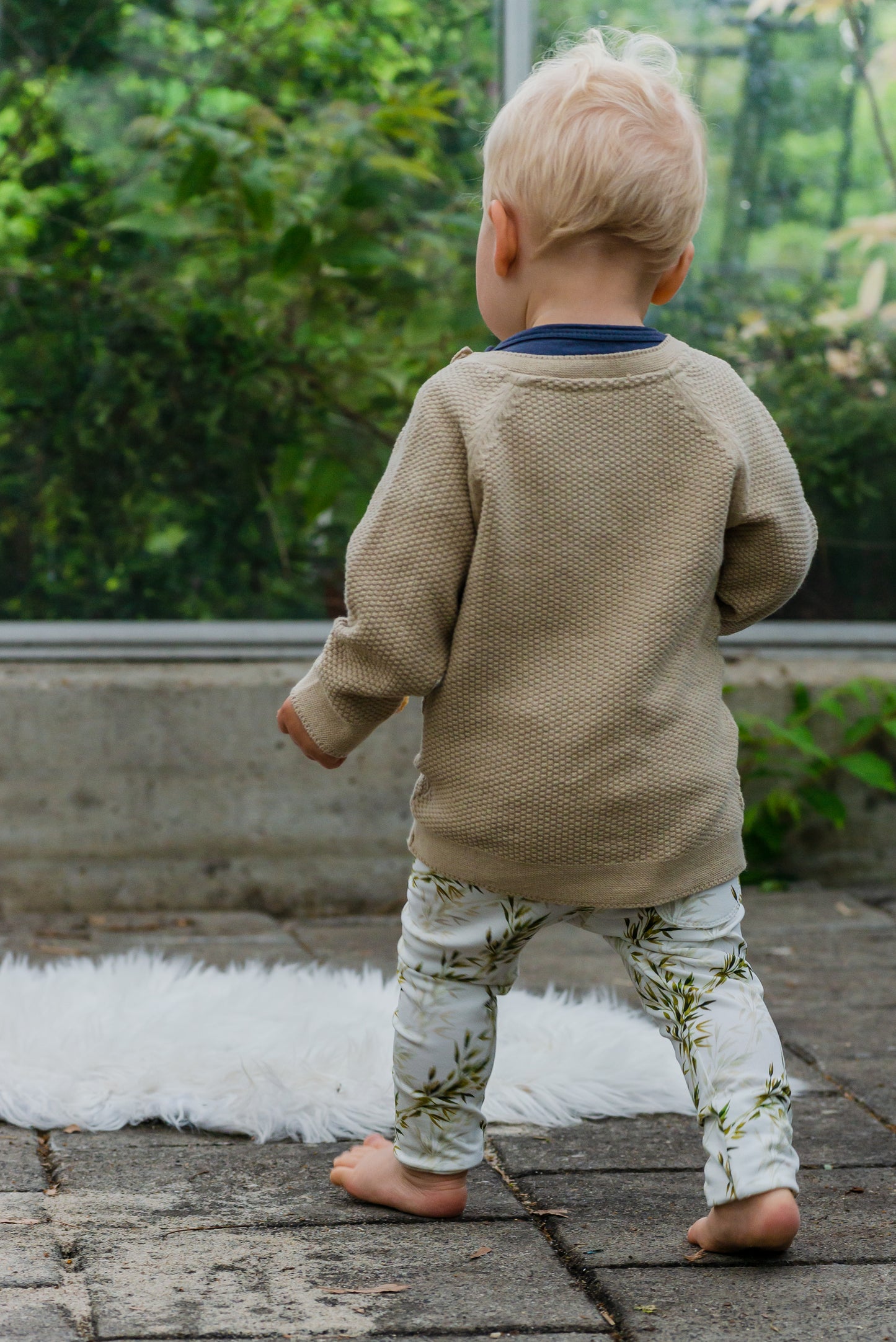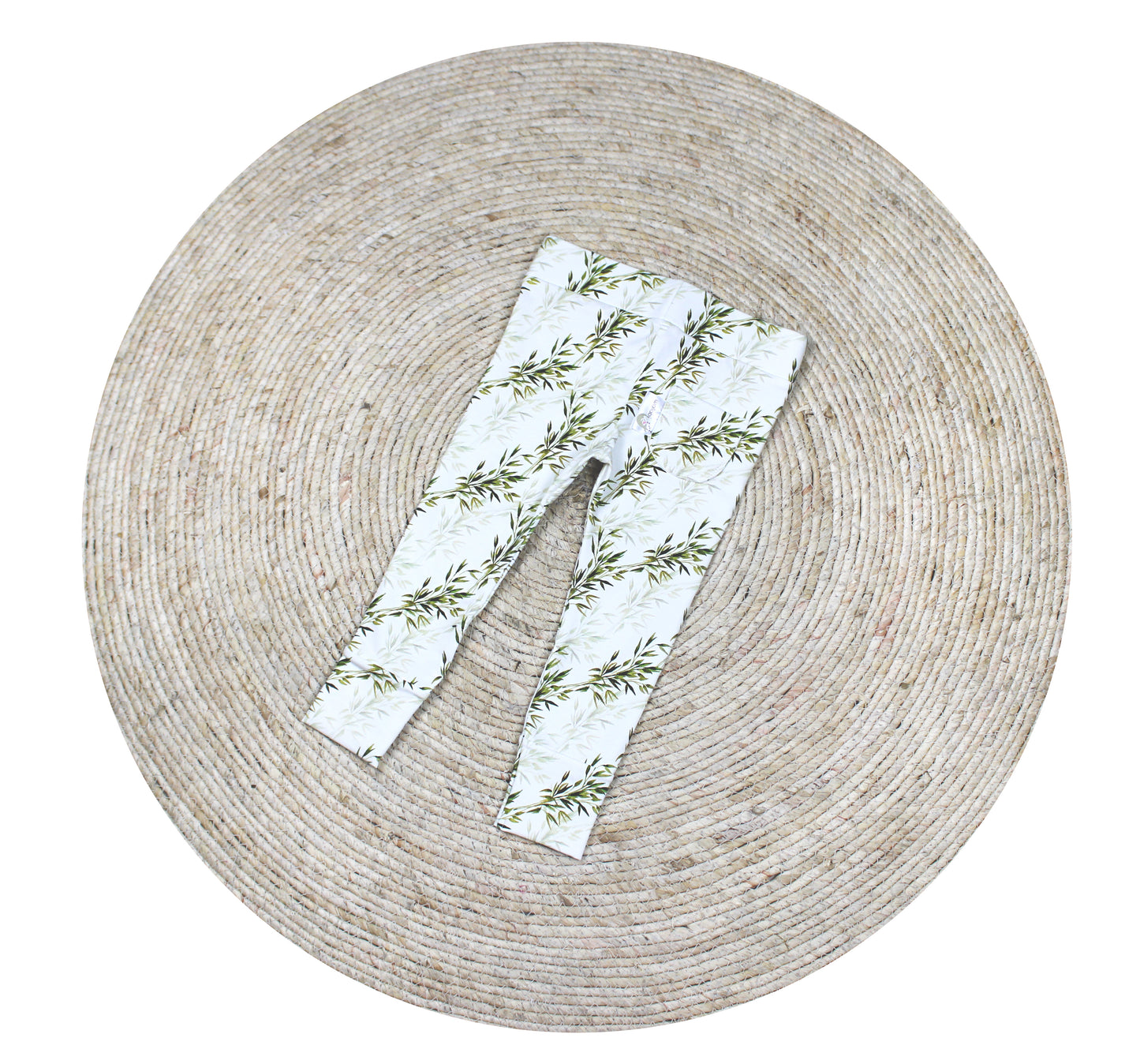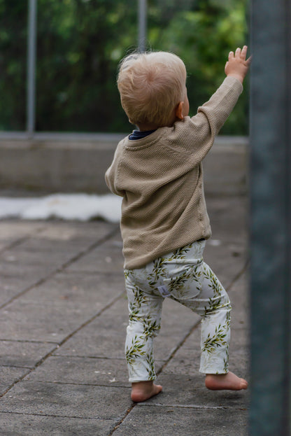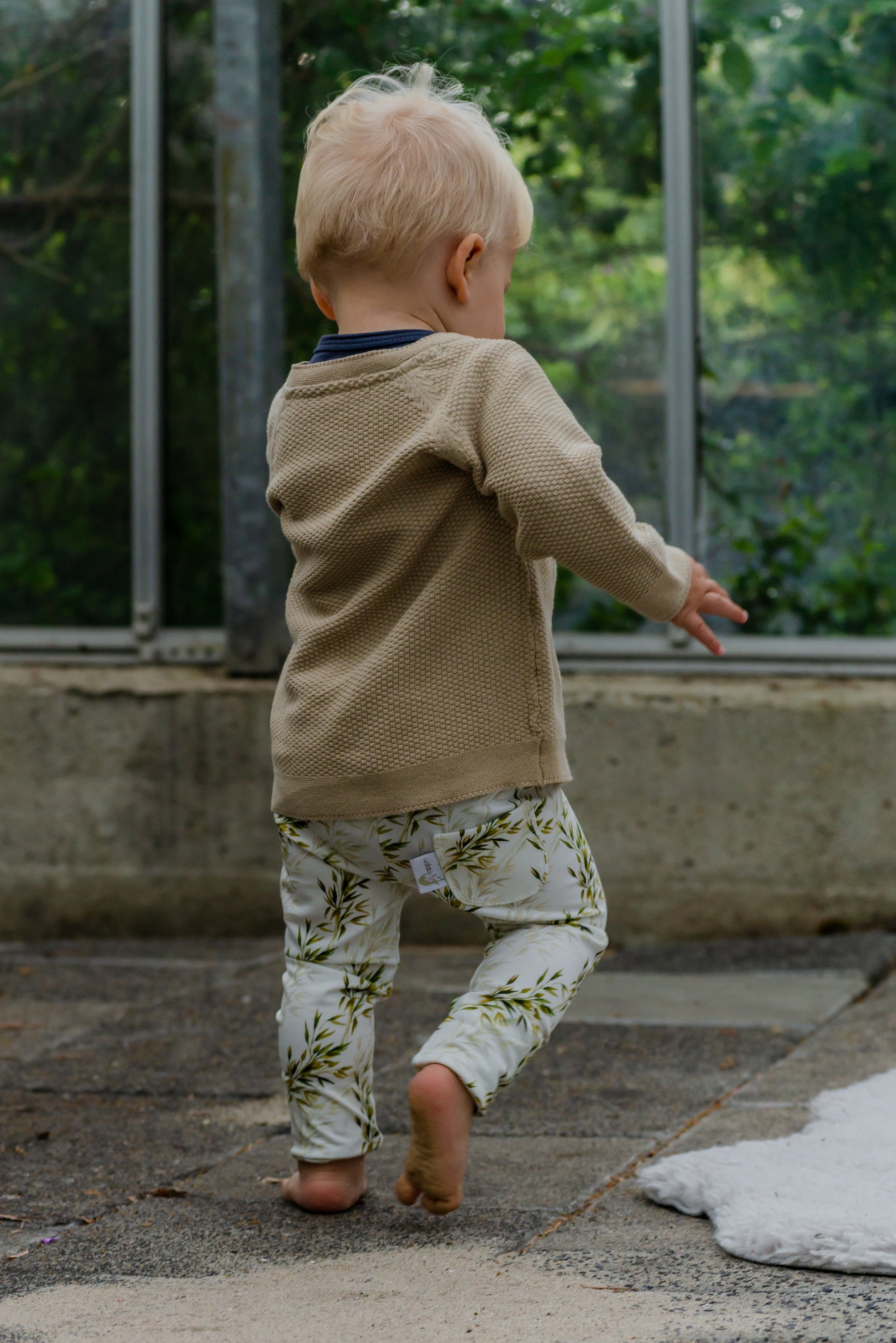 The bottom is made of elastic cotton with a beautiful print. The top edge is made of wide and sturdy elastic so that the bottom does not fall down quickly. The legs can easily be turned up, making the bottom wear longer. But our nicest detail is of course the mini small back pocket on the back of the pants!