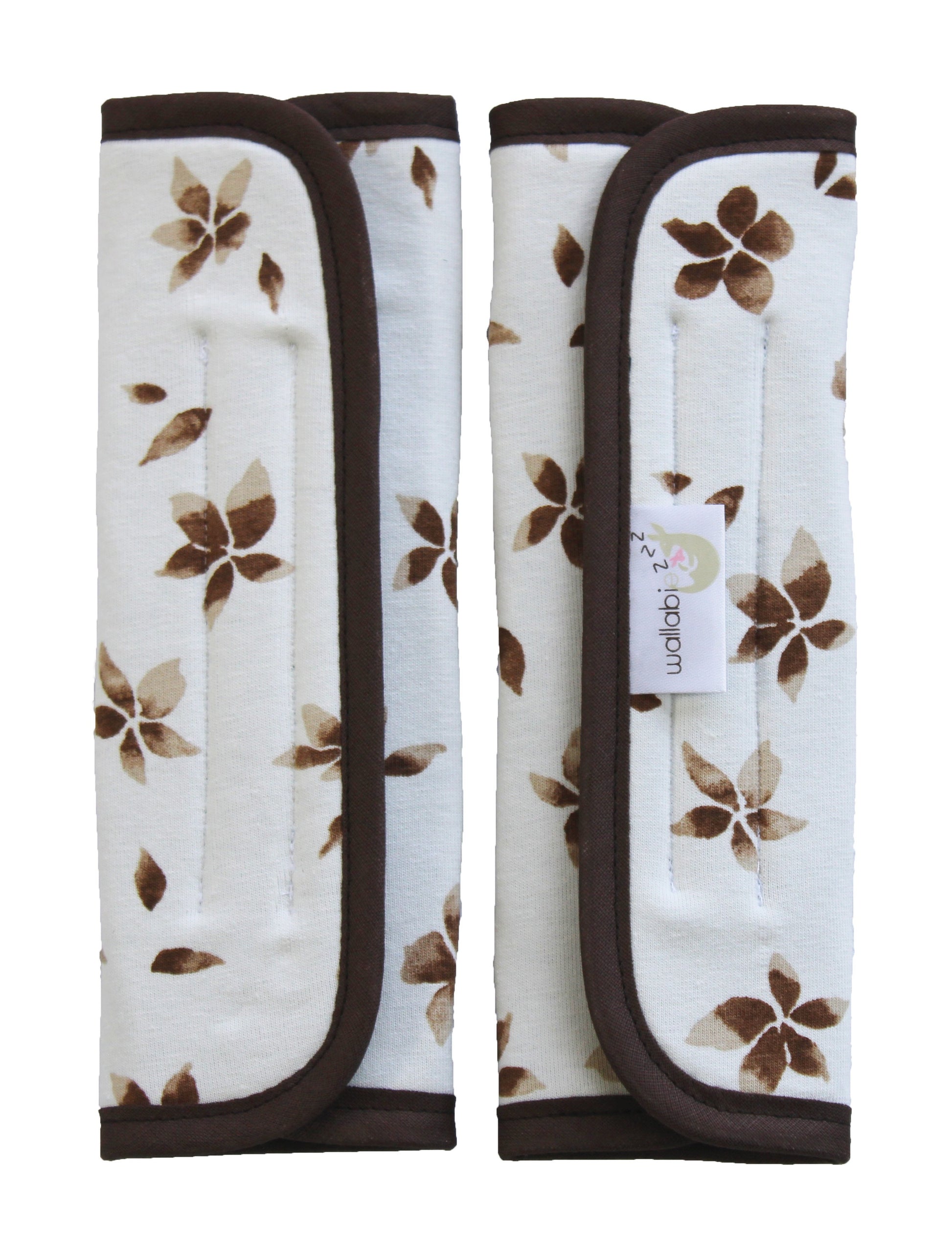 These snugly fitted Wallabiezzz belt padding covers, with a white background with brown Flower pattern, are designed for the belts from prams, buggies, or universal car seats of Group 1+. These amazing belt padding covers secure your child in their seat and remains comfortable for your child at all times.