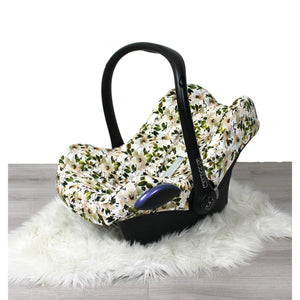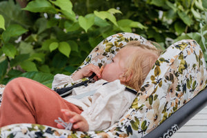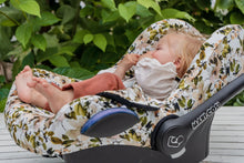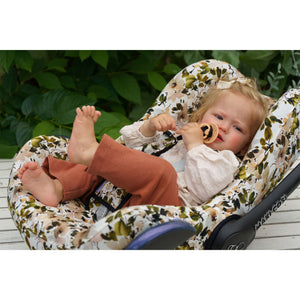 This comfy Wallabiezzz cover, a white background with flower pattern, is designed for Maxi Cosi CabrioFix, Citi, Pebble and many other car seats. This cover breathes and absorbs very well. Its elastic band fits perfectly with the Maxi Cosi.