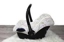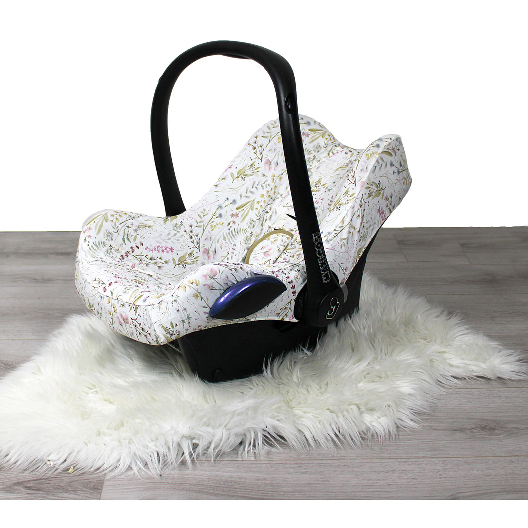 This comfy Wallabiezzz cover, a white background with flower pattern, is designed for Maxi Cosi CabrioFix, Citi, Pebble and many other car seats. This cover breathes and absorbs very well. Its elastic band fits perfectly with the Maxi Cosi.