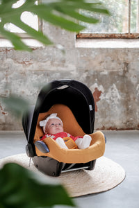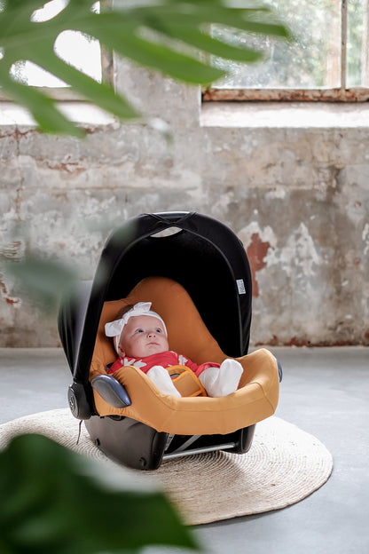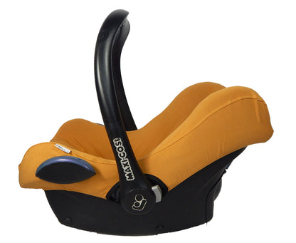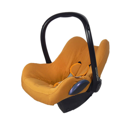 This comfy Wallabiezzz cover, a mustard/ocre color, is designed for Maxi-Cosi and many other car seats. This cover breathes and absorbs very well. Its elastic band fits perfectly with the Maxi-Cosi.