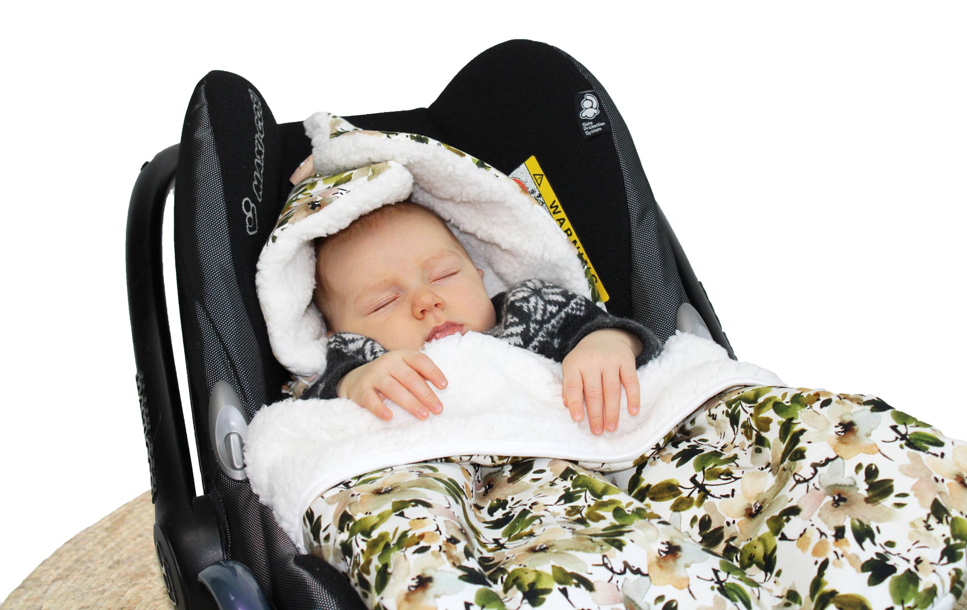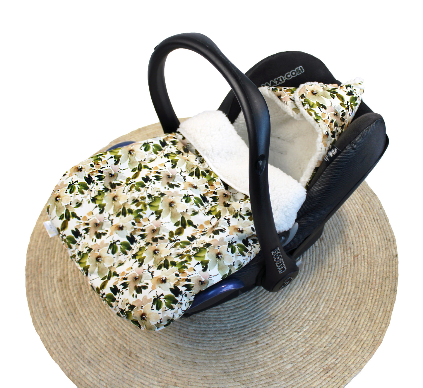 This snugly warm Wallabiezzz Maxi-Cosi footmuff, with a white color background with beautiful Appeltree flower pattern, is designed for keeping your child cozy during the winter and is suitable for Maxi-Cosi car seat. Our Wallabiezzz Maxi-Cosi footmuff closes and opens from left to right with a zipper. The hoodie can be worn either open or closed.