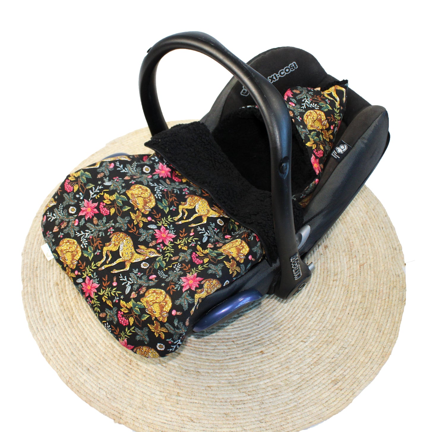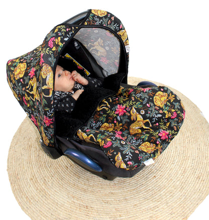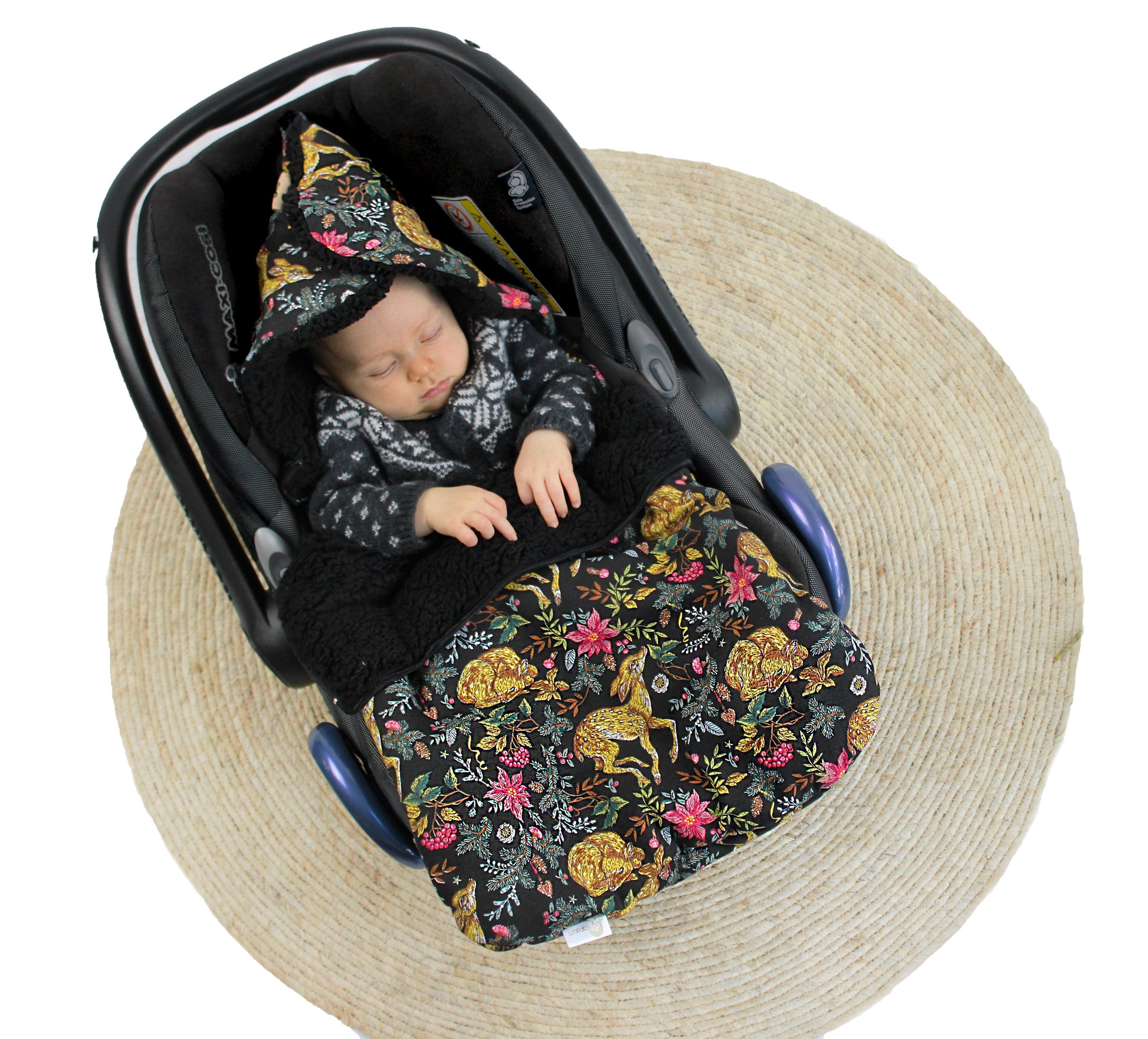 This snugly warm Wallabiezzz Maxi-Cosi footmuff, a black background with gold Deers pattern, is designed for keeping your child cozy during the winter and is suitable for Maxi-Cosi car seat. Our Wallabiezzz Maxi-Cosi footmuff closes and opens from left to right with a zipper. The hoodie can be worn either open or closed.