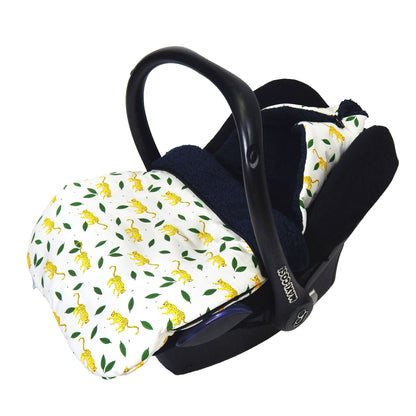 This snugly warm Wallabiezzz Maxi-Cosi footmuff, a white background with Leopards pattern, is designed for keeping your child cozy during the winter and is suitable for Maxi-Cosi car seat. Our Wallabiezzz Maxi-Cosi footmuff closes and opens from left to right with a zipper The hoodie can be worn either open or closed.