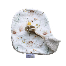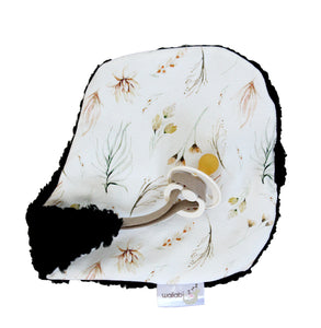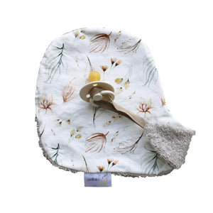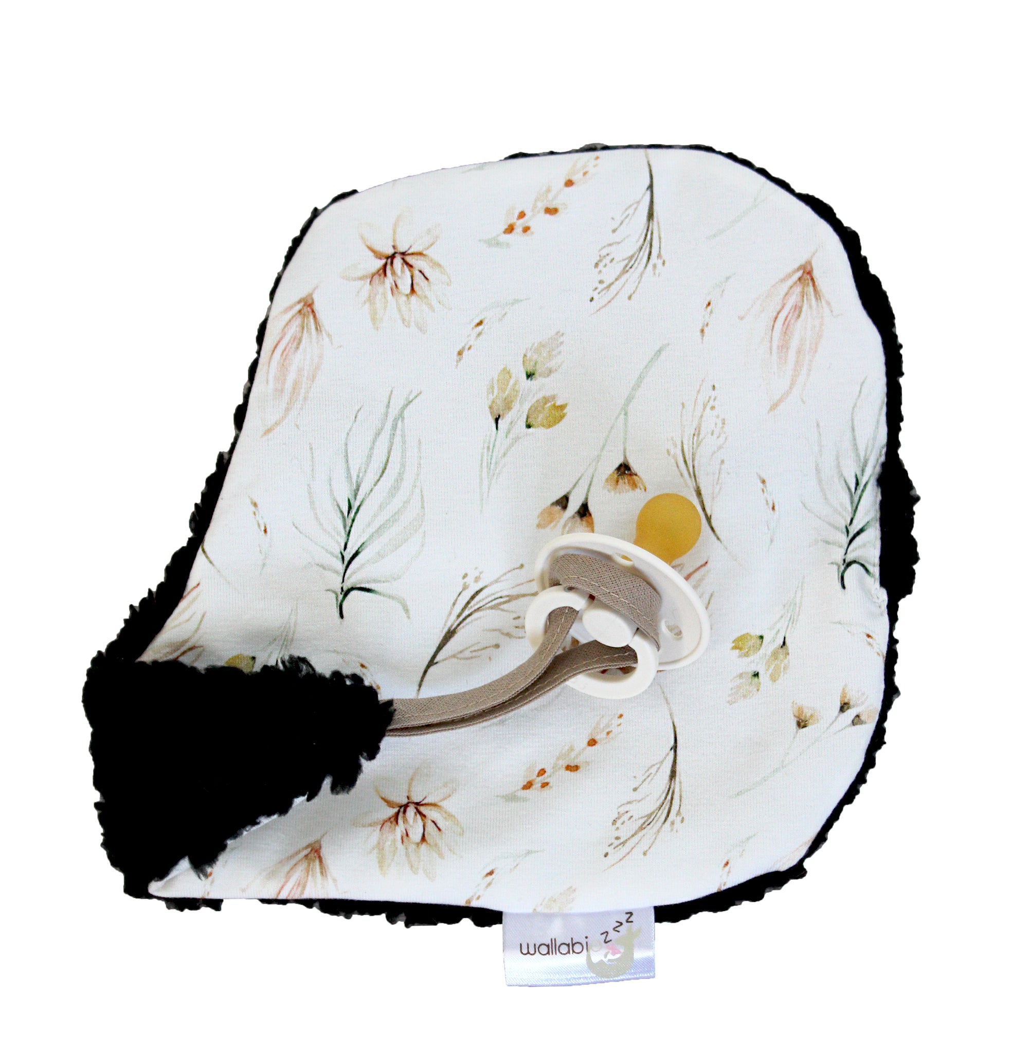 This soft Wallabiezzz pacifier cloth, a white background with Bohemian flower pattern, is designed for any pacifier. The pacifier cloth breathes and absorbs very well.