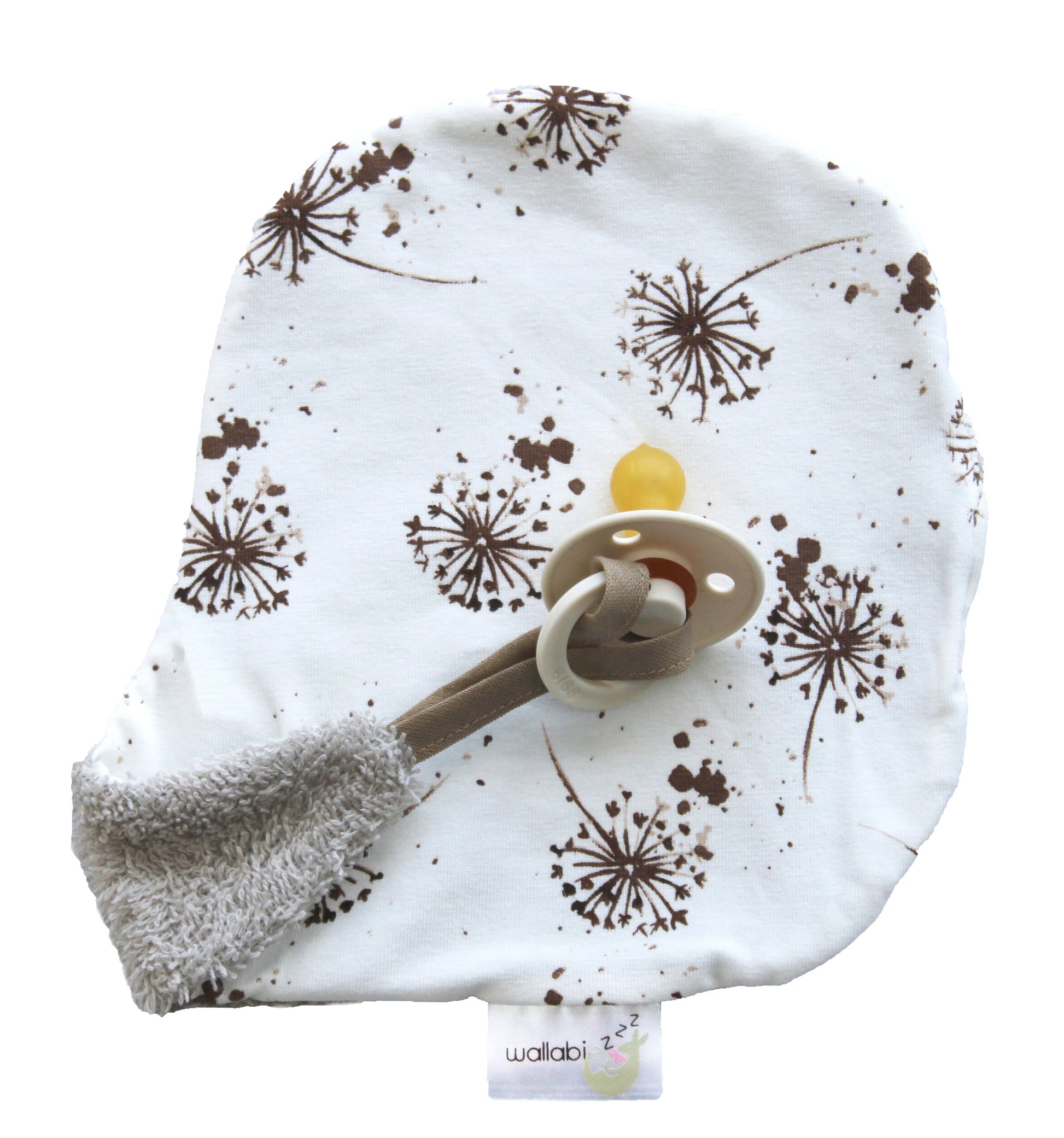 This soft Wallabiezzz pacifier cloth, a white color background with brown Dandelions pattern, is designed for any pacifier. The pacifier cloth breathes and absorbs very well.