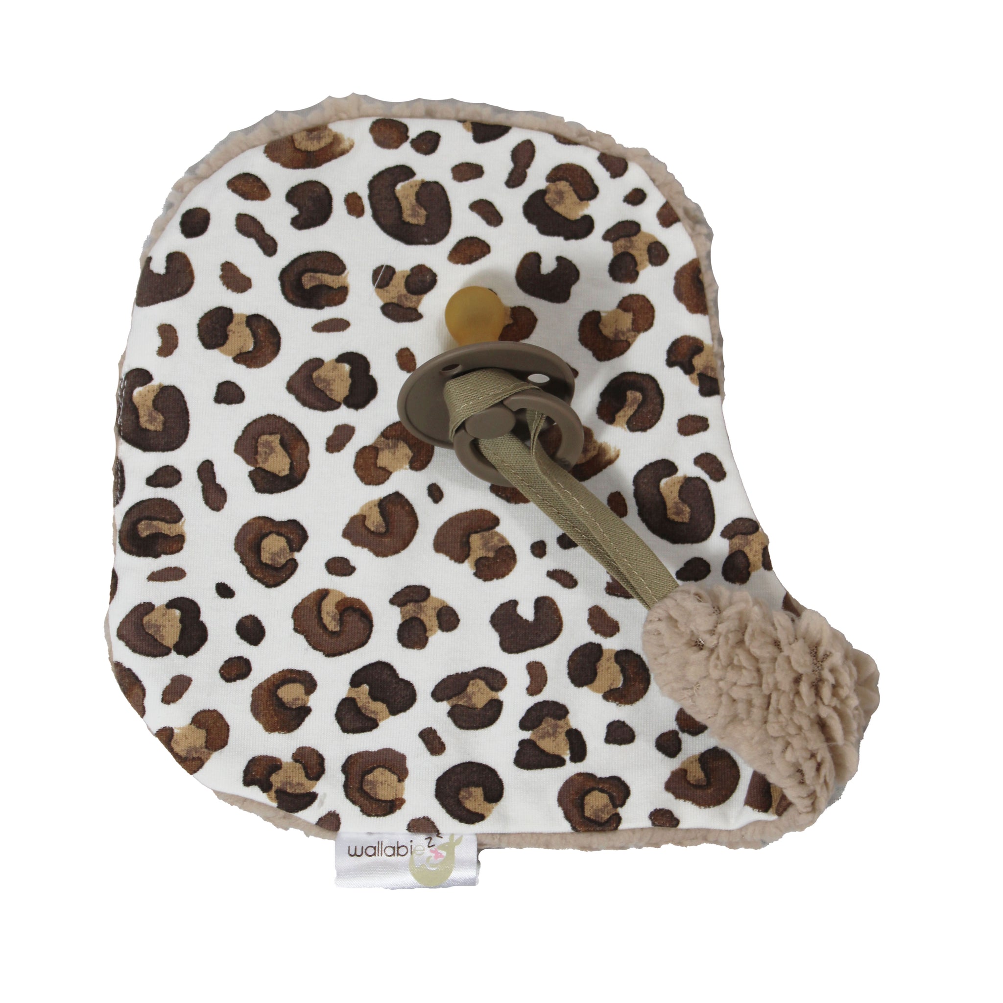 This soft Wallabiezzz pacifier cloth, a white color background with brown Leopard pattern, is designed for any pacifier. The pacifier cloth breathes and absorbs very well.