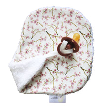 This soft Wallabiezzz pacifier cloth, a white background with pink Blossom pattern, is designed for any pacifier. The pacifier cloth breathes and absorbs very well.