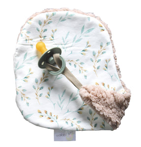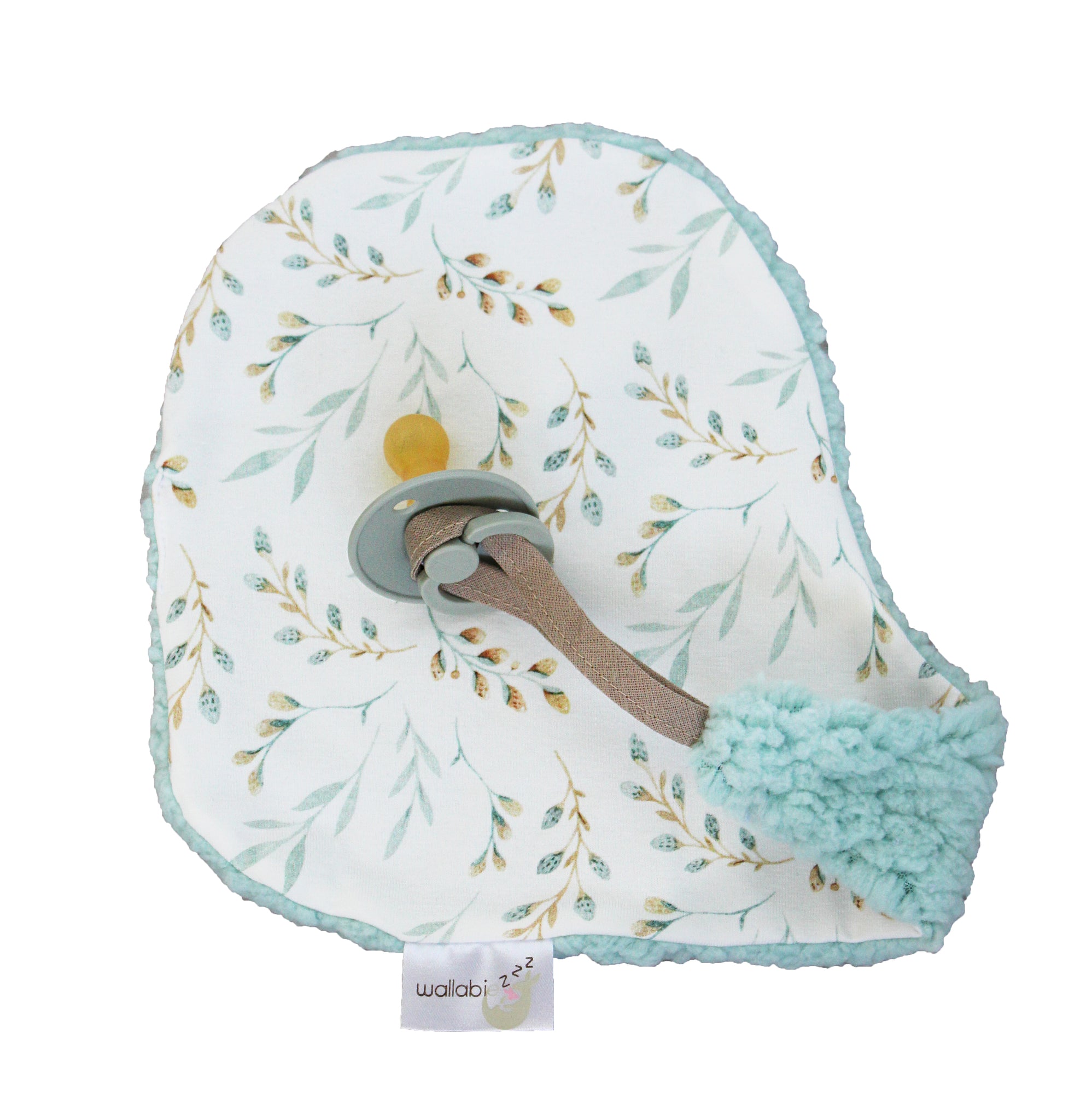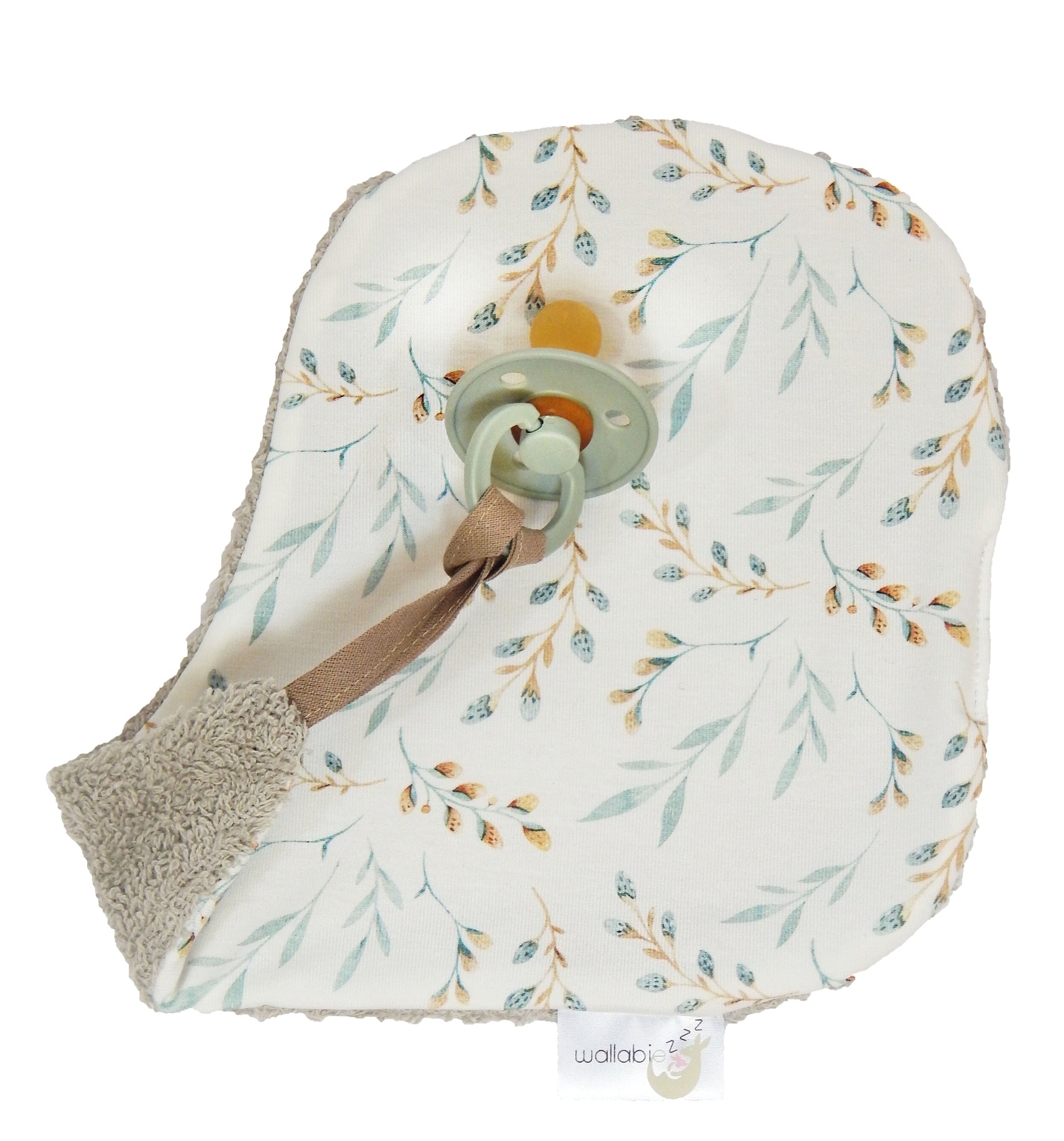This soft Wallabiezzz pacifier cloth, a white background with grey Willow pattern, is designed for any pacifier. The pacifier cloth breathes and absorbs very well.