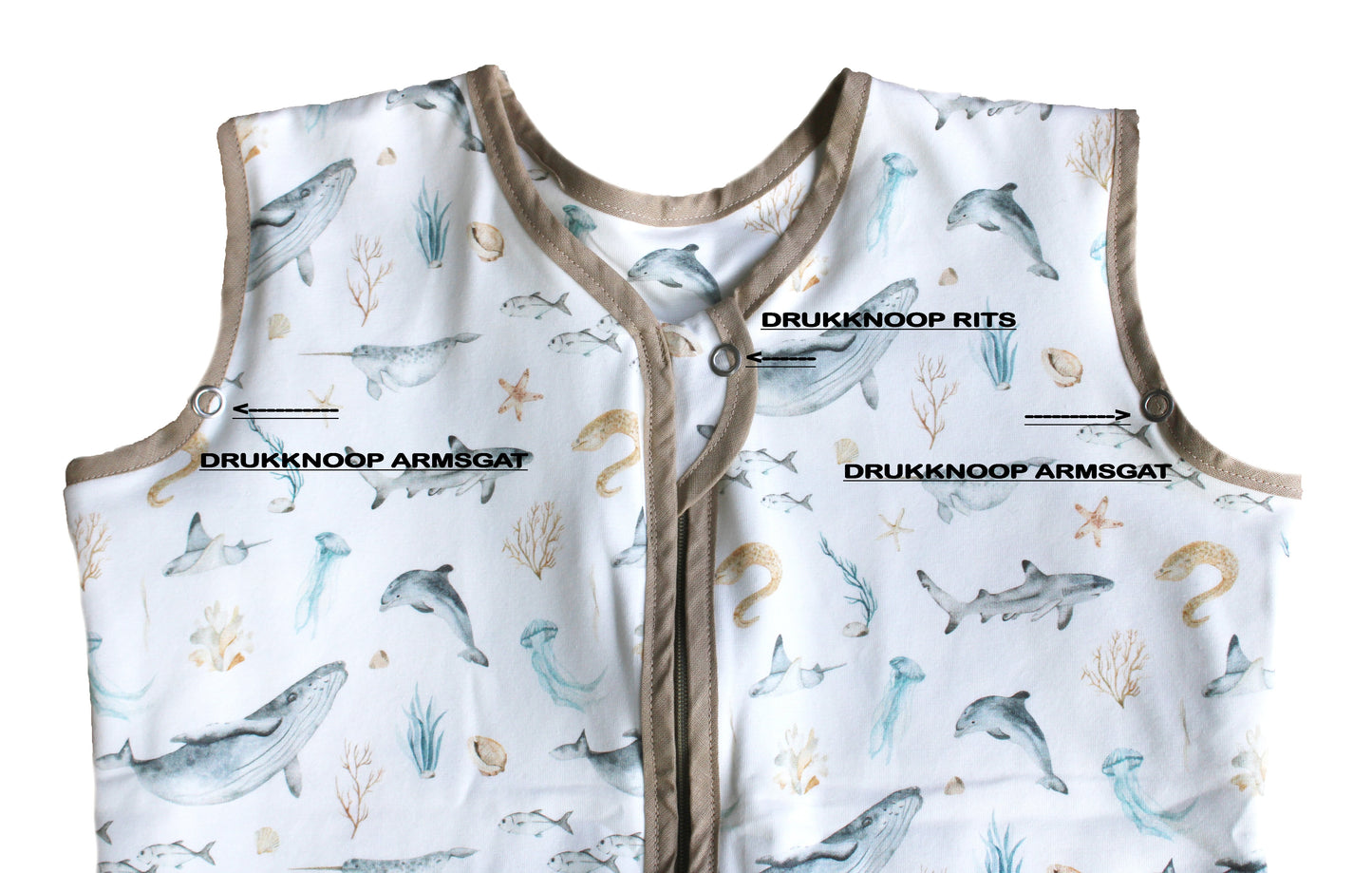 De armsgaten zijn uitgerust met een extra drukknoopje, zodat je de opening kunt aanpassen en smaller kunt maken. Dit is ideaal voor baby's met smalle of wiebelige armpjes, zodat ze ook veilig en snugly in hun slaapzak kunnen liggen. Kortom, een geweldige keuze voor een veilige en comfortabele nachtrust voor je kleintje!