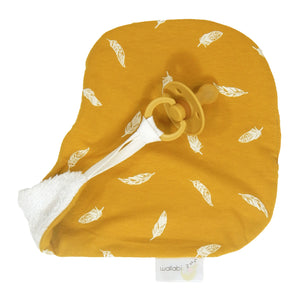 Ontdek het speendoekje van Wallabiezzz in een prachtige okergele kleur met witte veertjes. Dit zachte en ademende doekje biedt comfort voor je kleintje en is perfect om een speentje aan vast te maken. Gemaakt van hoogwaardige, kindvriendelijke materialen, is het doekje niet alleen stijlvol, maar ook praktisch in gebruik. Een must-have voor elke ouder!