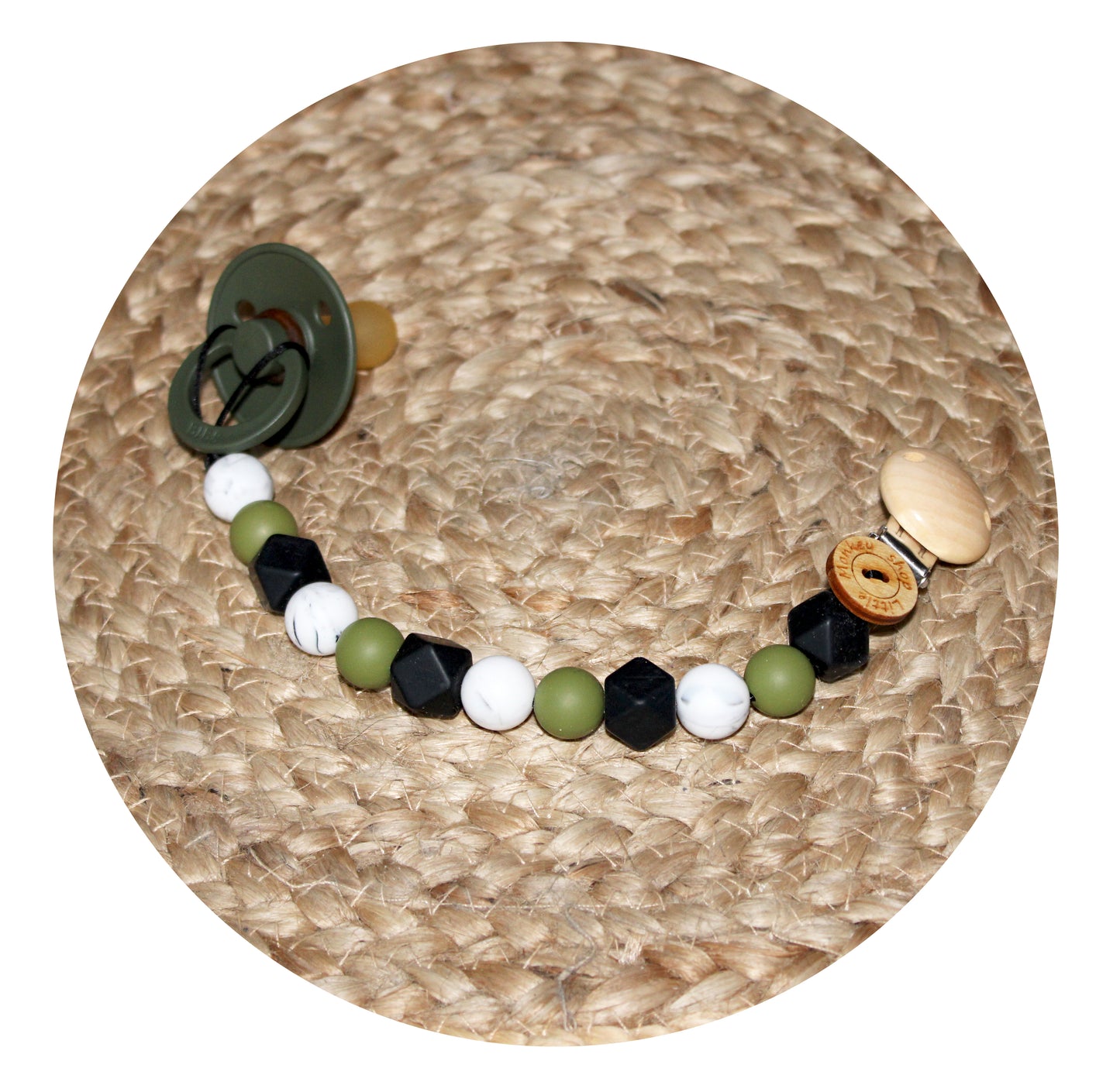 Dit ideale speenkoord van Little Monkey Shop in de kleuren zwart, olijf en marmer, zorgt ervoor dat het speentje van jouw kindje altijd binnen handbereik is. Het koord is gemakkelijk te bevestigen doormiddel van het klip-systeem. Het speenkoord is gemaakt van zachte BPA vrije, siliconen kralen waardoor het bijt vriendelijk is voor je baby.